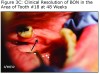 An evaluation of the site on September 27, 2011 showed that the area of BON had not healed and the buccal tissue adjacent to the exposed bone appeared enlarged. The antibiotic regimen was changed to include Augmentin® 875 mg (Sandoz Inc. Princeton, NJ) plus 500 mg metronidazole (Flagyl®; Teva Pharmaceuticals, Wales, Penn) to be taken twice daily. Prognosis for the BON lesion was guarded. The necrotic bone in this area started to separate from the mandible following re–epithelization below the bone (Figure 3A) and at 6 months (Figure 3B) shows the lesion was healing. At 7 months the necrotic bone was easily removed by the Greenebaum Cancer Center’s attending dentist and the site was left to heal by secondary intention. A clinical photograph (Figure 3C) at 48 weeks of treatment with antibiotics and antimicrobial mouth rinse revealed resolution of BON. Antibiotics and antimicrobial mouth rinse were discontinued. Currently, the patient continues to receive Zometa infusion quarterly as part of his MM management. Following lesion resolution the patient has received routine dental care including dental hygiene instrumentation with his private dentist.