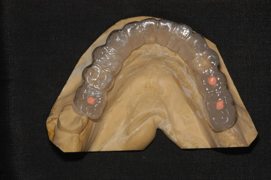 A few records are necessary to determine the treatment options for the patient and placement of the implant(s). When considering potential implant treatment, the standard of care today is for the patient to receive a computed tomography (CT) scan. The patient should wear a radiographic guide during the scanning procedure. This radiographic guide is a great communication tool to help the surgeon visualize implant placement (Figure 25). To make the radiographic guide, maxillary and mandibular mounted impressions need to be obtained to determine the correct bite and location of the teeth to be replaced with implants. The guide is prescribed and made in a dental laboratory.