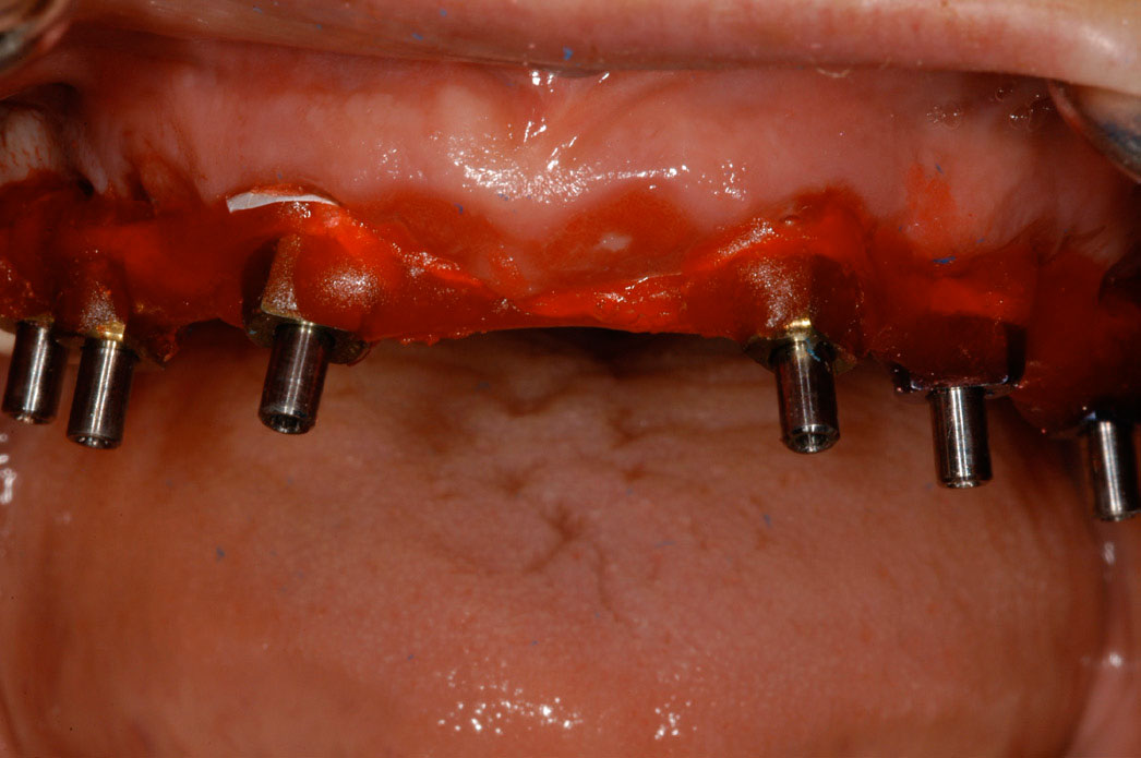 After approximately 4 months of healing, the final denture can be fabricated. This can be made of acrylic or porcelain. Both achieve great esthetic results, but porcelain is three to four times more expensive. Recent studies show that it is beneficial to splint implants together with a fixed temporary denture versus a removable transitional denture because it decreases the risk of failure.23