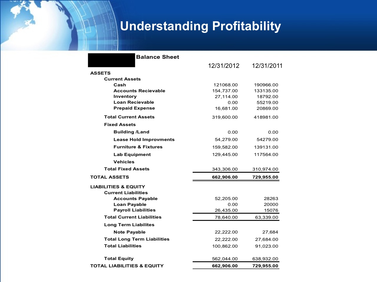 From the balance sheet come two different ratios that can tell owners much about the health and welfare of their enterprise. The current ratio—also known as the liquid ratio—is calculated by dividing assets by liabilities. It is a reflection of near-term solvency; 2.4 is considered healthy. The return on asset ratio is calculated by dividing current assets by current liabilities. It reflects the rate of return received for each $1 dollar invested in the laboratory.