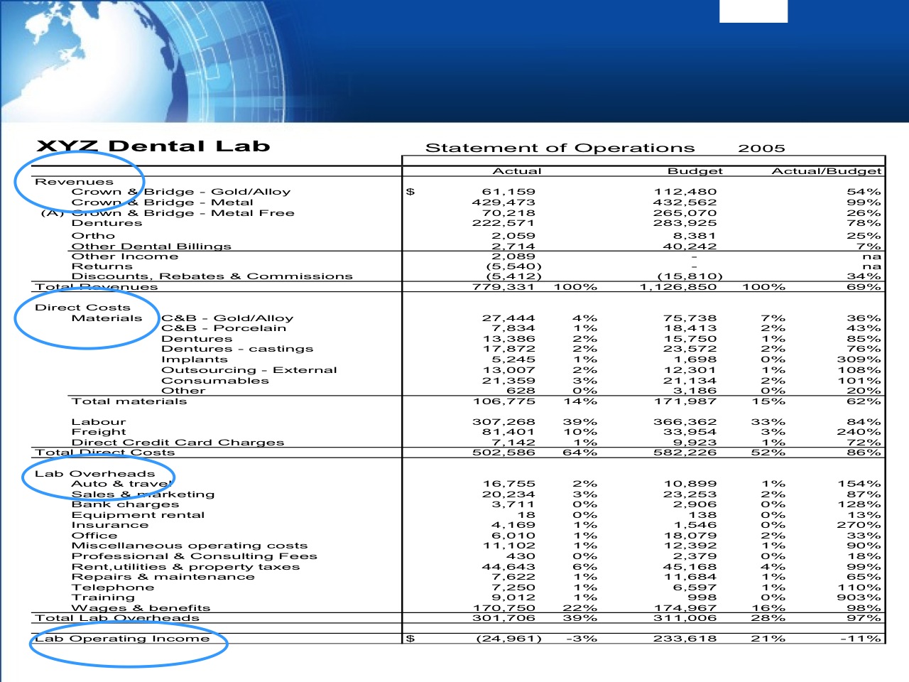 On the actual overall P&L (Table 4), there is much more detail, but the same categories still appear. In this particular example, the lab compares Actual to Budget. By doing this, labs can see where exactly they under- or over-spend. Overall, the lab represented in Table 4 is under budget by 11% (see lower right side); however, areas that are over budget and therefore in need of attention are: Implants (under Direct Costs Materials), which is 309% over; Freight (240% over), and Training (903% over).
