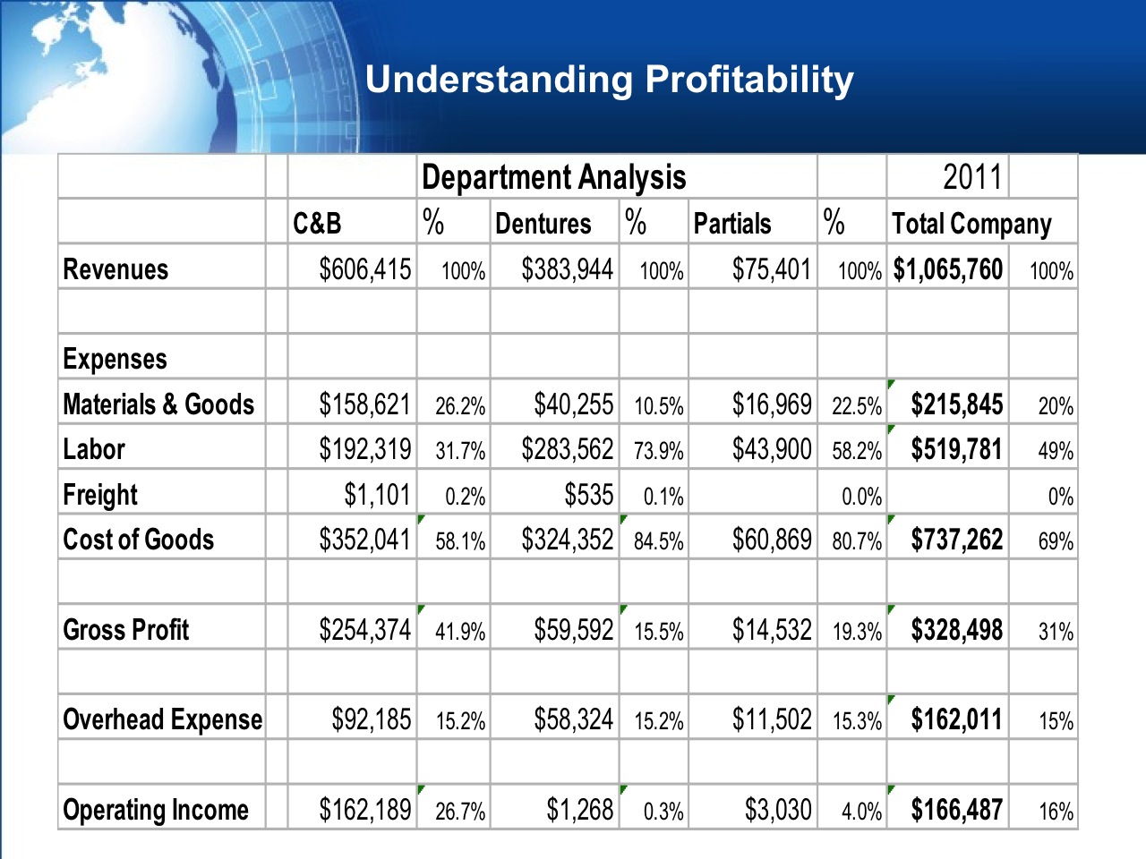 This same report can be applied on a departmental basis to identify good/bad performance within specific functions. As shown in Table 3, the “bottom line”—ie, Operating Income—shows that that dentures and partials are in need of attention.
