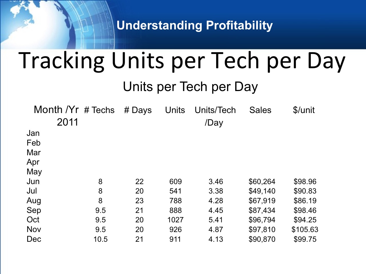• Units/lab staff/day (output per employee) —Daily units produced divided by the number of technicians; should show a positive trend that indicates the workforce is more productive (Table 6).