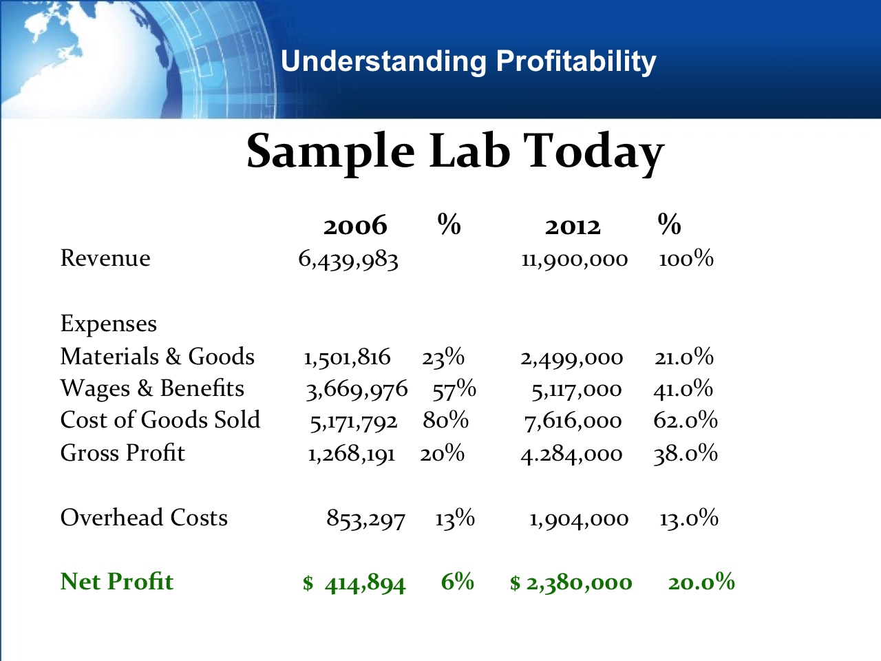 As shown in Table 7, a profitable lab should be generating at least 20% profit by being aware of and attentive to both the costs—materials, labor and benefits, cost of good sold, and overhead—and revenue generated.