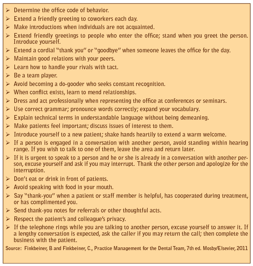 Professional business etiquette refers to the social guidelines and manners to be followed in business situations when dealing with patients, staff, and other clients. The professional behavior may be based on custom and morality. In reality, business etiquette in the dental office is applying acceptable social guidelines, demonstrating social manners, and communicating effectively with all the persons who come into the dental office on a daily basis.