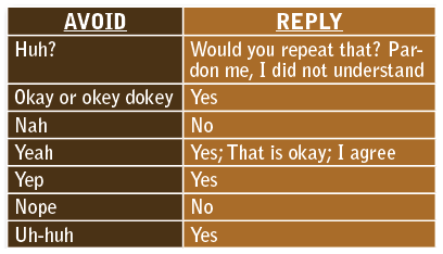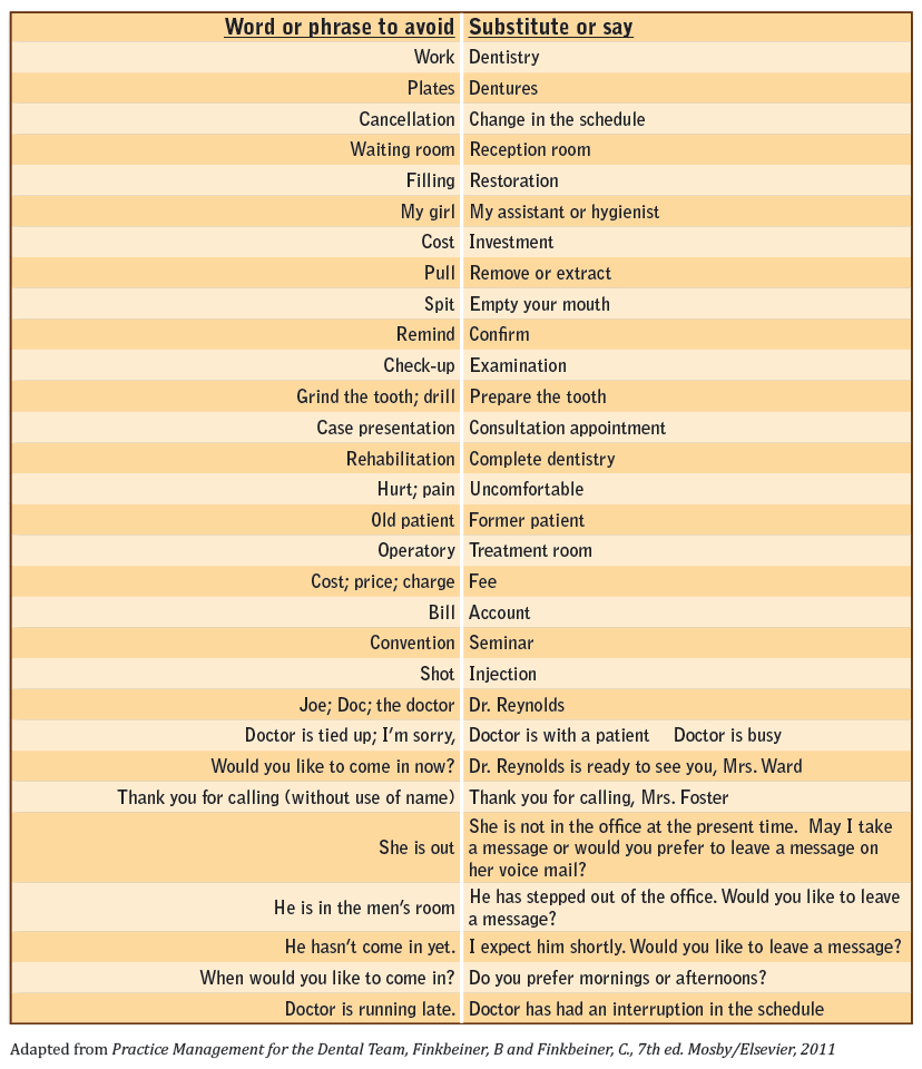 The speaker should think about phrasing and determine if what is said is positive and provides a sense of comfort to the patient. It is wise to have a list of these words or phrases for new employees with substitute words or phrases for each (Figure 2 and Figure 3).