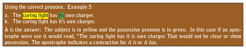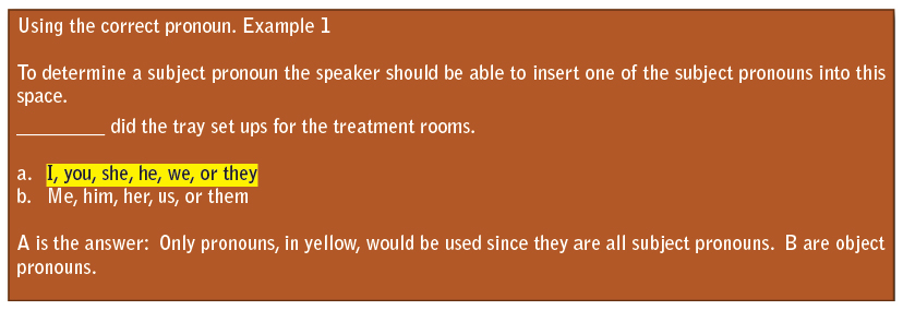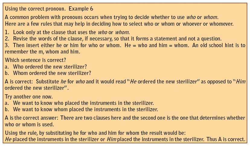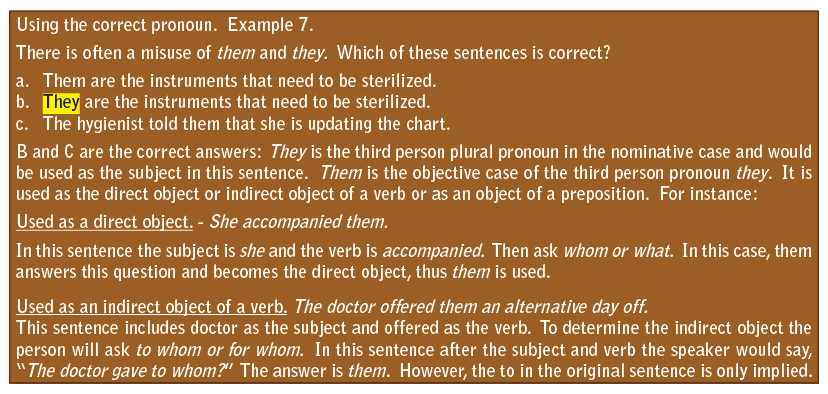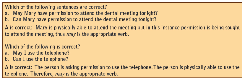 It is impossible in a course of this length to provide an entire grammar course. However, it is necessary to draw attention to some of the most common errors in grammar. It is important that the entire staff is aware of the need to use proper grammar and, when necessary, should be willing to make the proper changes in grammar to ensure a good professional image. There are a couple of good grammar reference books on the market that can be purchased on the Internet. These would be good additions to the dental office library and the administrative assistant may want to assign readings to staff members who are using poor grammar in the office. The Only Grammar Book You’ll Ever Need by Susan Thurman, Adams Media, Avon, MA, and The Blue Book of Grammar and Punctuation by Jane Strauss, 10th ed., Jossey-Bass, San Francisco, CA, are both excellent references.