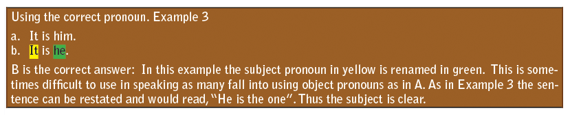 A pronoun is a word that is used in the place of a noun. Pronouns may be in one of three cases: Subject, Object, or Possessive. Common subject pronouns are: I, you, she, he, we, and they. Common object pronouns are: you, me, him, her, it, us, or them. Common possessive pronouns are: yours, mine, his, hers, ours, theirs, and its. Possessive pronouns show ownership and do not need an apostrophe.