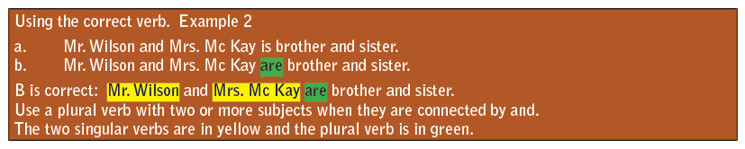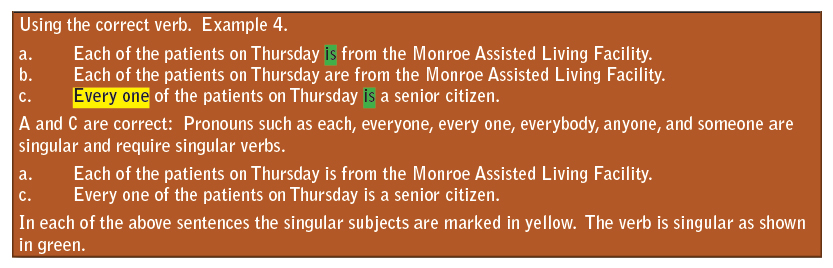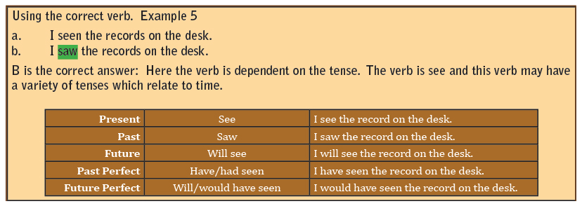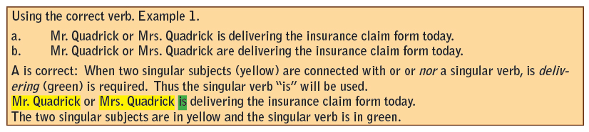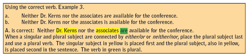 Be certain the subject and verb are in agreement. A singular subject takes a singular verb and a plural subject takes a plural verb. A hint is to recognize which verb to use with he or she and which verb would be used with they. See the following examples in the right-hand margin for subject and verb agreement (Example 1 through Example 5).