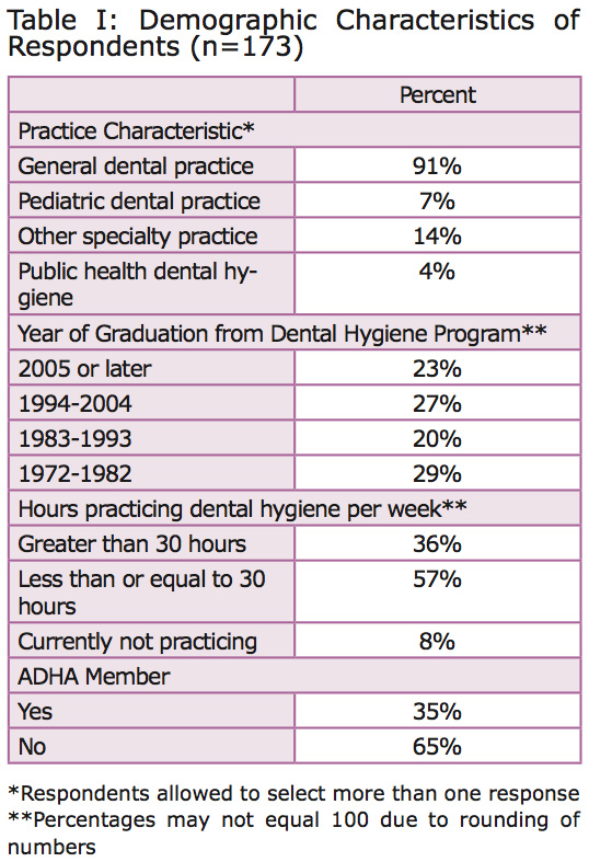 Most of the respondents reported that they were employed in general practice, but over half were employed <30 hours per week (Table I). A small percentage was not practicing, and 35% were members of the American Dental Hygienists’ Association (ADHA). The respondents’ years of graduation were distributed similarly in intervals from 1972 to present.