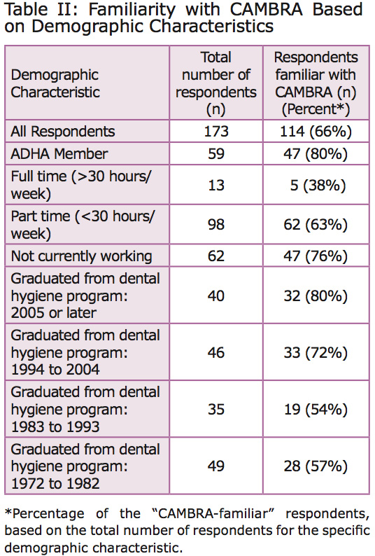 Of the 173 respondents, 66% reported that they were familiar with the term CAMBRA. Examining the demographic characteristics of the respondents on the basis of their familiarity with CAMBRA provided additional information (Table II). The majority of ADHA members, those currently working, and those having graduated within the past 20 years, were familiar with CAMBRA.