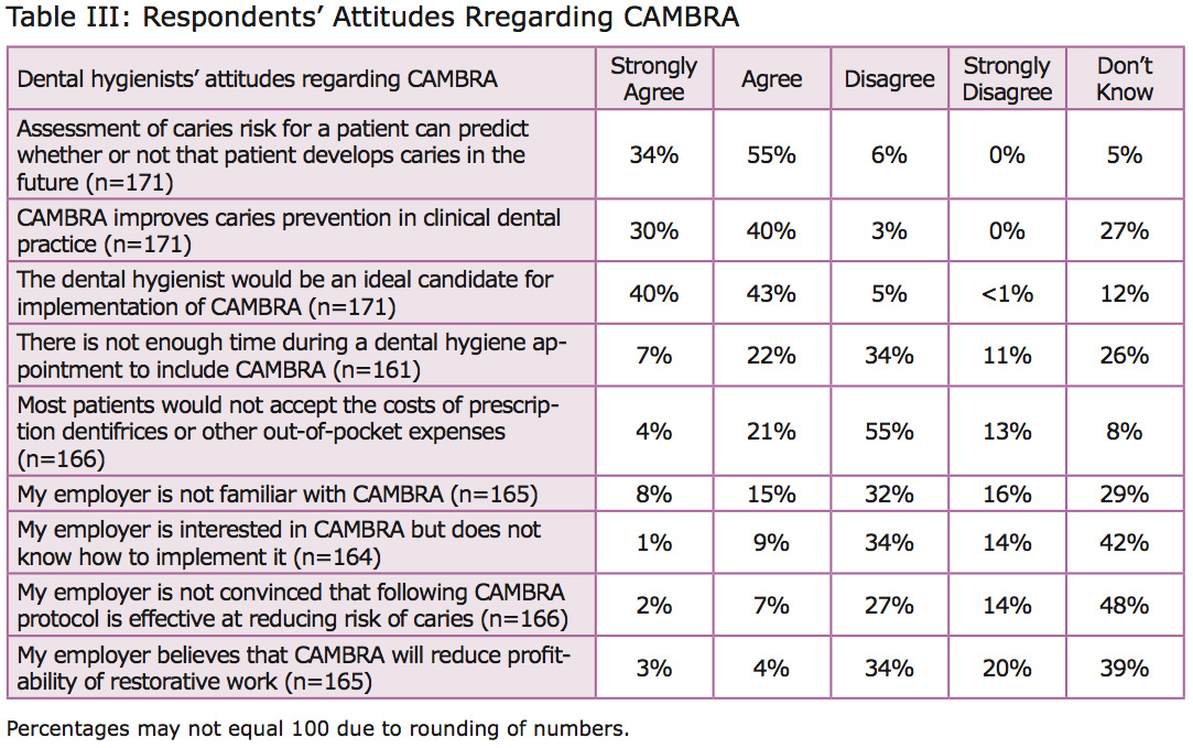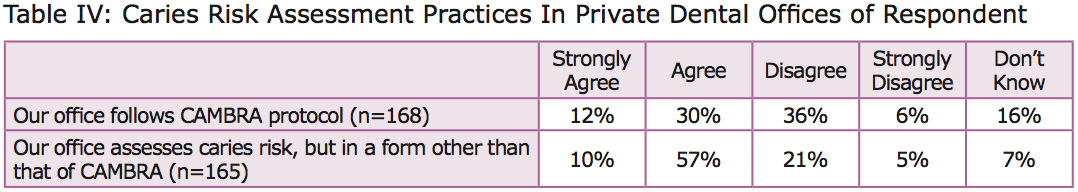 Results: The response rate was 18%. Only 66% of the respondents were familiar with the term CAMBRA, although 89% agreed with its underlying principles of risk assessment. CAMBRA protocol had been implemented in 40% of the respondents’ employment sites. Respondents disagreed that time (45%) and cost of products (68%) were barriers to implementation. Many did not know their employers’ knowledge or attitudes about CAMBRA and its implementation, as evidenced by a “don’t know” response range of 29 to 48% for the four relevant statements. Respondents’ comments included both successes and barriers implementing CAMBRA.