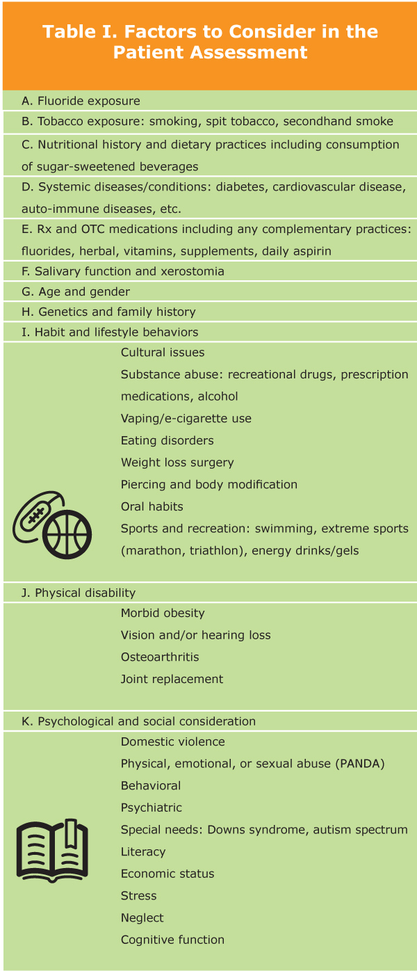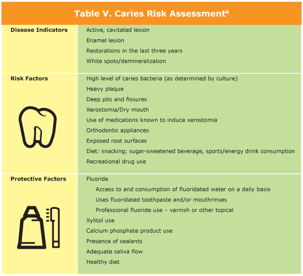 It is now recognized that caries is a multifactorial, complex disease that is not easily prevented or arrested by simply suggesting better brushing and flossing. A more sophisticated look at caries finds it results from an imbalance in the factors that contribute the demineralization/remineralization process. Caries management by risk assessment (CAMBRA) has emerged as a best practice for identifying at-risk patients and developing interventions and preventive strategies at the earliest possible stage of disease. CAMBRA evaluates the caries balance/imbalance on three variables: disease indicators, risk factors, and protective factors. Table 5 highlights key information to be acquired on each variable.8