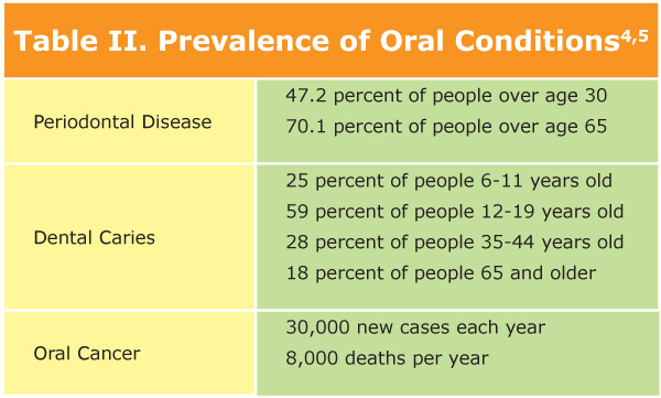 Oral diseases are some of the most prevalent conditions affecting adults and children today (Table 2). Every patient should be evaluated for their risks for periodontal disease, dental caries, and oral cancer. Because risk is fluid, assessment should be done on some level at each visit. However, after an initial baseline, the frequency and depth of each future assessment will depend on the currently identified risk. For example, people who smoke will be at a higher risk for both periodontal disease and oral cancer and may need more aggressive screenings than an individual who has never smoked and/or has no other risk factors present.