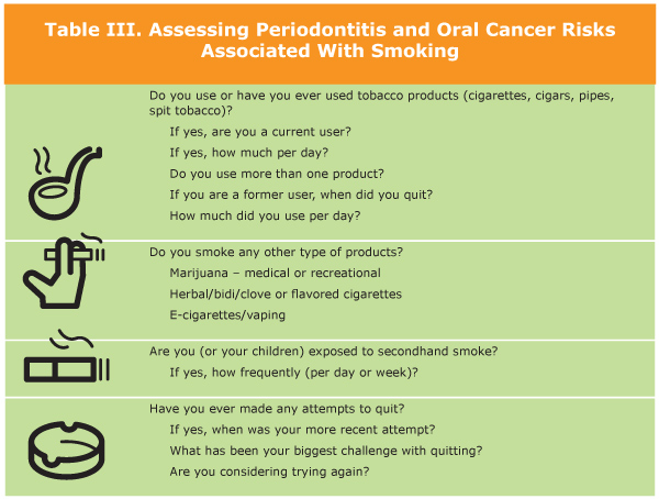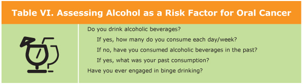 Tobacco, alcohol, and exposure to the human papillomavirus (HPV) are the top risk factors for the development of oral cancer.4 According to the American Cancer Society, heavy tobacco use (smoking and spit tobacco) is still one of the strongest risk factors for oral cancer, along with heavy use of alcohol. Seven out of 10 patients with oral cancer are heavy drinkers, and being both a heavy drinker and smoker makes a person up to 100 times more likely to develop oral cancer.9 Table 3 and Table 6 highlight the information needed to assess smoking and alcohol risks.