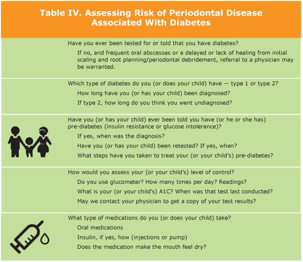 In determining the risk for current and future periodontal disease, it is well established that the two strongest risk factors are smoking and having diabetes.1 Individuals who smoke are about four times more likely than nonsmokers to develop periodontal disease. Heavy smokers often have the most severe cases.2 In recent years, it has been shown that people exposed to secondhand smoke are also at an increased risk for periodontal disease.6 People with diabetes are significantly more likely to develop periodontitis.1 For those diagnosed with diabetes in their youth, data indicate that nearly a third will have some periodontal disease by time they are in their mid-thirties.7 Individuals with the poorest glycemic control appear to be at the greatest risk.1 Both smoking and poorly controlled diabetes may negatively affect treatment outcomes.1,2 Smoking cessation and improvements in blood sugar appear to have a positive effect on the disease.1,7 Periodontal risk can be assessed through good questions in the medical history. Table 3 outlines the questions to assess the risk from smoking and Table 4 outlines questions for diabetes.