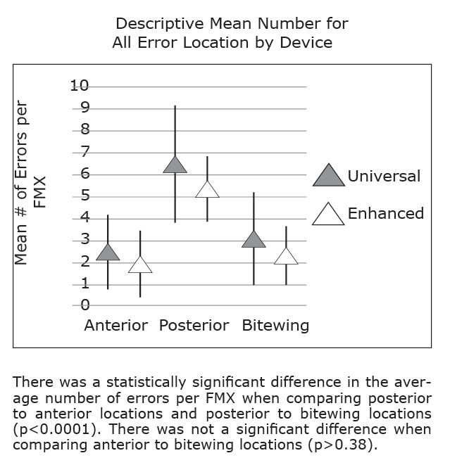 Figure 7 shows the error rates based on location. The average number of all errors that occurred was evaluated based on location in the mouth (Anterior, Posterior, Bitewing) and by device (universal vs. enhanced). There was a difference in the average number of errors when comparing posterior (universal device = 6.5 vs. enhanced device = 5.4) to anterior locations (universal device = 2.5 vs. enhanced device = 2.0) and posterior to bitewing locations (universal device = 3.1 vs. enhanced device = 2.3). The model showed a statistically significant difference in the average number of errors per FMX when comparing posterior to anterior locations and posterior to bitewing locations (P < .0001). There was not a significant difference when comparing anterior to bitewing locations (P > .38).