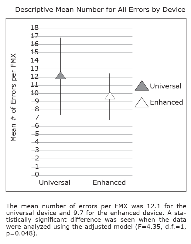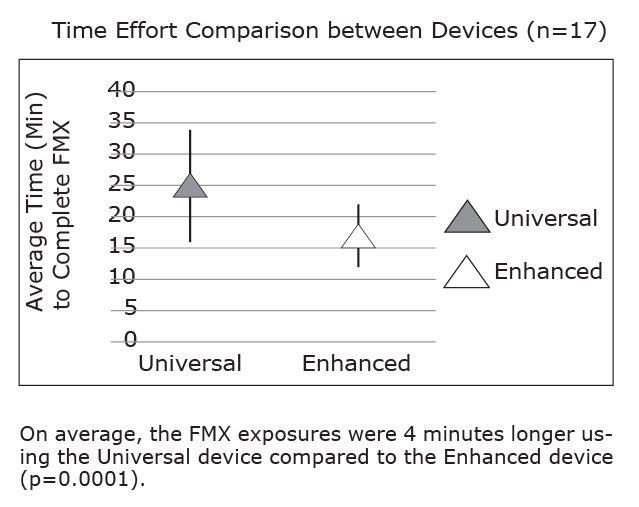 Time required to complete a FMX by device was evaluated. Average time required to complete a FMX using the universal and enhanced device was 21 minutes and 17 minutes respectively. Significantly less time was needed (4 minutes) to expose a FMX when using the enhanced device (P = .0001) (Figure 8).