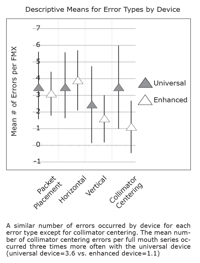 When the devices were compared based on technical performance there was not a consistent pattern seen where one device outperformed the other with respect to packet placement, vertical angulation, or horizontal angulation errors. However, the enhanced device produced significantly fewer overall errors when compared to the universal device. The type of error that was primarily reduced with the enhanced device was collimator cutting. This finding is in contrast to that reported by Zhang et al.5 Zhang’s study reported an increase in collimator cuts and suggested that the device may be modified to increase the aperture opening in the device.5 Interestingly, the current study discovered that there was minimal difference between the devices in the number of errors requiring a retake to render a diagnostic image. Thus, most of the collimator centering errors that were made did not influence the diagnostic quality of the image. In contrast to the current study’s results, Parks et al found that use of the Rinn® Snap-on rectangular collimating device resulted in a statistically higher number of retakes when compared to the other devices tested (ie, snap-a-ray/round, XCP®/BAI paralleling/round, snap-a-ray/rectangular, XCP®/BAI paralleling/rectangular, XCP/BAI paralleling/Rinn® Snap-on, and Precision/rectangular).7 Although Parks et al did not offer an explanation for this finding, the greater number of retakes might be attributed to the attachment of the rectangular Rinn® Snap-on device to the alignment ring. In addition, Parks et al did not provide a description of the aperture opening for the 16-inch FFD rectangular collimator used in his study, which limits a comparison of his findings to the current study.7 Although not evaluated in this study, use of the XCP-ORA® may reduce the number of collimator cuts due to the notched aiming ring. This could be tested in future studies.