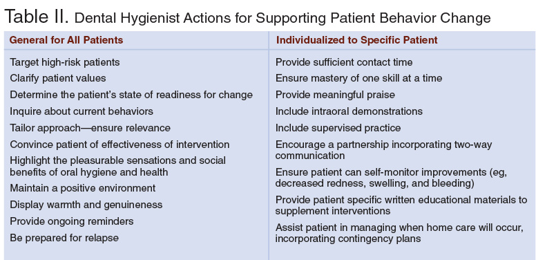 Table II summarizes important features of successful dental hygiene interventions designed to motivate patients into changing their home care behaviors. These factors combined with the patient's belief that he or she has control over his or her oral hygiene and health will increase the likelihood for positive behavior change.3