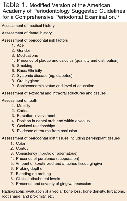 A modified version of the American Academy of Periodontology (AAP) proposed guidelines for a comprehensive periodontal examination is presented in Table 1.17 However, with respect to a functional PTP for the general dental practice, only the following principal diagnostic criteria can be addressed: age, PD, CAL, BOP, tooth mobility, furcation involvement, and percentage of radiographic bone loss. It must be emphasized that these criteria represent the minimal parameters for determining a periodontal diagnosis. There are many other important risk and modifying factors that will impact development and progression of disease and all such factors must be taken into consideration when establishing a definitive diagnosis and a diagnosis-driven treatment plan.18