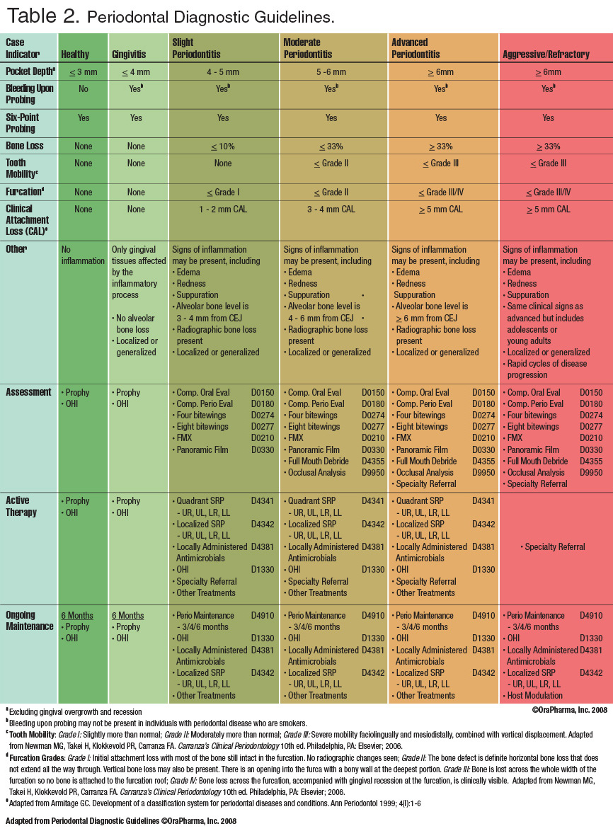 Regardless of recent advances in our understanding of the etiology and pathogenesis of the periodontal diseases, the assessment of traditional clinical parameters remain the foundation for periodontal diagnosis.15 Generally, such clinical parameters include probing depth (PD), bleeding on probing (BOP), clinical attachment level (CAL), degree of furcation involvement, extent of gingival recession, tooth mobility, and plaque score. Clinicians typically utilize the results from the periodontal exam, radiographs, and the patient's medical and dental histories to establish a diagnosis and evolve a goal/diagnosis-directed treatment plan. It has been clearly demonstrated that different interpretations of the same diagnostic information can have a dramatic impact on treatment decisions.16 For this reason, a standardized approach to periodontal assessments and a working protocol as to treatment parameters would fill a logical need in the average general practice set ting. However, due to extensive over laps in most classification systems, any standardized approach is subject to variations in both clinical assessments (eg, variations in probing depth among clinicians) as well as the interpretation thereof.