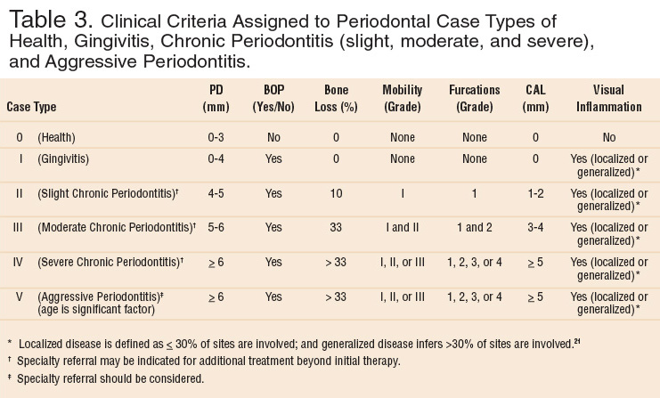 Some practice settings may prefer a system of "Periodontal Case Types" for purposes of diagnosis and record keeping. Table 3 presents the diagnostic clinical criteria as applied to Case Types for health, gingivitis, chronic periodontitis (slight, moderate, and severe), and aggressive periodontitis. These criteria and Case Types are generally appropriate but should be considered as guidelines only and not as a definitive diagnosis. As mentioned before, there are numerous modifying and risk factors to consider prior to evolving a diagnosis and a diagnosis-driven treatment plan.