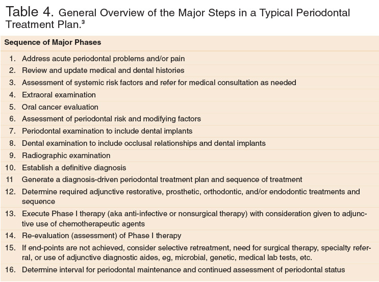 Development of a logical and properly sequenced treatment plan is a derivative of the periodontal assessment and diagnosis. Periodontal therapy is diagnosis-driven and, to the extent possible, should address all modifying factors and risk factors that impact development and progression of plaque-induced periodontal disease. An overview of a typical periodontal treatment plan is presented in Table 4.30