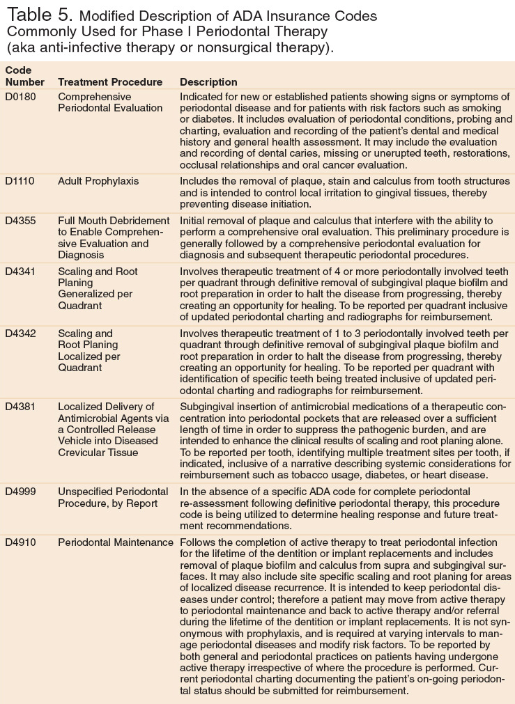 Table 5 presents a modified description of the ADA insurance codes most commonly used in Phase I periodontal therapy (aka anti-infective therapy or nonsurgical therapy). The descriptions are intended to reveal distinctive differences between procedures, and guide the clinician in reimbursement procedures.
