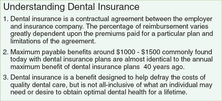 To simplify decisions made by patients, dental insurance should be referred to as "reimbursement," "benefit," or "assistance" by the clinician and other staff members rather than "coverage" since the word implies complete. Most patients with dental insurance will find it necessary to supplement whatever insurance benefit they receive toward lifetime periodontal care, as many plans have contract limitations for the percentage of reimbursement associated with various procedures and/or the length of time those benefits apply. For example, limitations of some insurance plans assign benefits for PM following SRP but only for 24 months following active therapy. As another example, exclusions found in other insurance plans assign benefits for SRP for generalized periodontal disease but not for localized infection. Many patients are reticent to proceed with treatment unless their insurance will "pay for it." Consequently, it is advantageous for practices to have clear explanations about the reality of dental insurance. Figure 2 presents a sample explanation of dental insurance that can be shared with patients, assisting them in making independent decisions about treatment, regardless of the insurance reimbursement schedule.