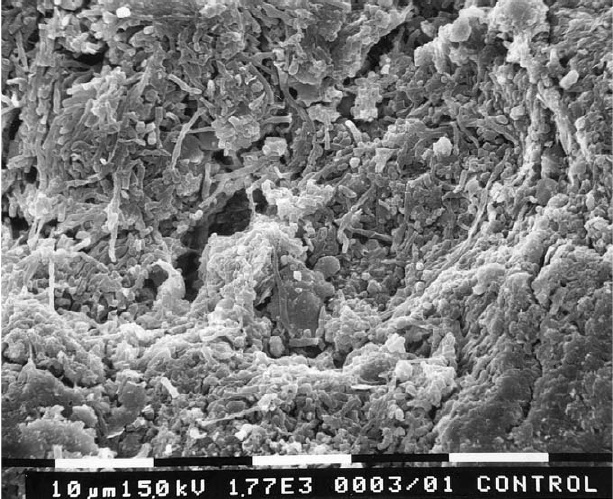 Figure 3  Scanning electron microscopic photograph of dental calculus characterized by a superficial layer of microbial biofilm. Bar = 10 micron at an original magnification of 1,770x.