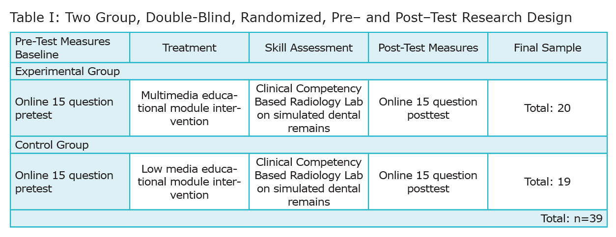 Mayer’s “Modality Principles” and Stoeckel et al’s recommendations for mass-fatality training in dental students were the basis for the use of multimedia and a “hands on” clinical competency-based radiology lab for the mass-fatality training in this study.3-6,20 A two-group, randomized, double-blind, pre- and post-test research design was used (Table 1). The sample for this educational evaluation included dental hygiene students in their first semesters of the second year of an entry-level baccalaureate degree program. All participants were required to have completed prerequisite coursework, to have completed 1 year in oral radiology, and to be certified in Virginia radiation safety. Pregnancy or suspected pregnancies were part of the exclusion criteria, due to the use of portable radiation devices in atypical positions. After Institutional Review Board approval, the researchers invited students to participate in the study via on an online announcement. Participation was voluntary, and students could withdraw from the study at any time without impacting their status in the dental hygiene program; 42 participants completed informed consent documents and were enrolled and randomly assigned to either the control group (n = 21) or experimental group (n = 21).