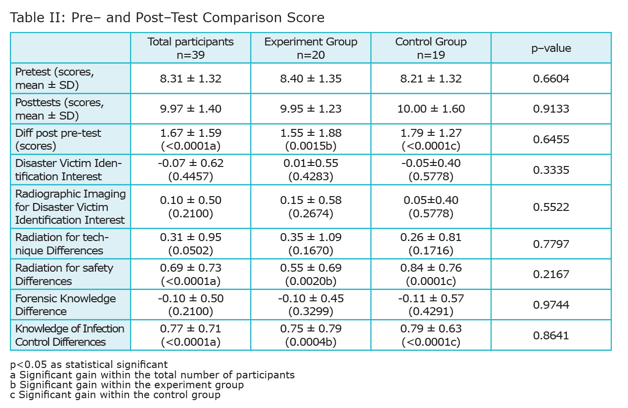 In the control group, the mean score for the pre-test was 8.2 (SD = 1.31), with a mean post-test score of 10 (SD = 1.59). Similar analysis revealed a significant improvement in scores with P value < .0001. Students reported similar interest in learning more about the role of the dental hygienist in disaster-victim identification for mass-fatality incidents from baseline (99.9%) to post-test (94.8%). Students reported slightly more interest in exposure to radiographic images on postmortem remains at the post-test (94.7%) compared to baseline (88.6%). Specifically, interest in disaster-victim identification had significant gain from pre-test to post-test scores, where the mean difference score was -0.07 (SD = 0.634) (P = .45). Results also suggest students from both groups showed an increased interested in postmortem radiographic imaging after the educational modules and clinical competency-based radiology lab, with a mean difference score of 0.12 (SD = 0.57).