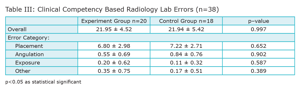 For the clinical competency-based radiology lab portion of the study, the higher the score on the radiographic evaluation form, the worse the performance or increase in errors per radiographic image. The experimental group had an overall mean score of 21.95, and the control group had an overall mean score of 21.94. No significant difference was found between the experimental and control groups in overall laboratory scores (P = .997). Comparisons were also made between the experimental and control groups in the specific error categories, which included errors in placement of the digital image receptor, vertical and horizontal angulation errors of the position indication device, exposure errors, mounting errors, and an “other” category for errors that did not fall within one of the above mentioned categories. Between the two groups, there were no significant differences within the four categories of radiographic technique errors. Table 3 presents the means, standard deviations, and related P values for each category. Because there were no mounting errors recorded for either group, this category was omitted.