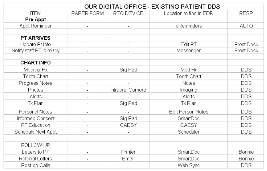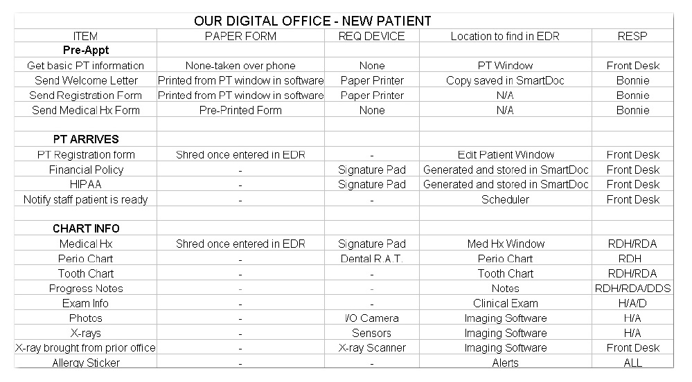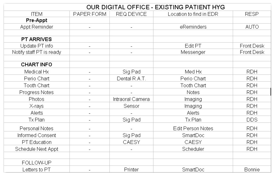 This process can be started by developing three different protocols: one for the new patient visit, one for a hygiene appointment, and one for a patient seeing the dentist. Specialty practices may have additional appointment categories to address. The appointed staff members should examine a selection of existing charts and begin to record the process. A sample spreadsheet is provided as a guide (Figure 2). By envisioning the patient visit, beginning with the initial phone call, to the patient walking through the door, and continuing until the patient exits the office, each step is recorded. Plan how the data collected at the appointment will be recorded, which team member(s) are responsible for recording it, and the need for any special digital device to record it. This process will take several meetings but will help the office in a smooth transition from the paper chart to the digital chart. Not only does this examination assist in preparing for a wonderful patient experience, but also helps the entire dental team clarify the responsibilities within the practice and aids in an efficient day once the system is in place.