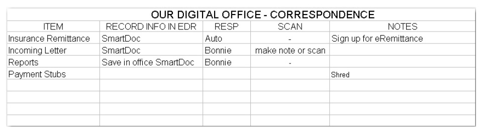 A major dilemma in converting paper charts to EDR’s is what to do with years of old progress/treatment notes. It is important to maintain compliance with state guidelines. Start by reviewing all notes and, if state laws permit, enter a summary note at the beginning of the patient’s electronic record that reports any information that would be pertinent to continuing the patient’s treatment. Remember, it is not necessary to retire the paper chart while treatment is still active. After the summary continuation note is entered, the office can choose to store the complete paper record in a safe location (to be accessed if necessary) or an office may choose to scan all the previous notes into the patient’s EDR. It is very important to check with state regulations on this topic.