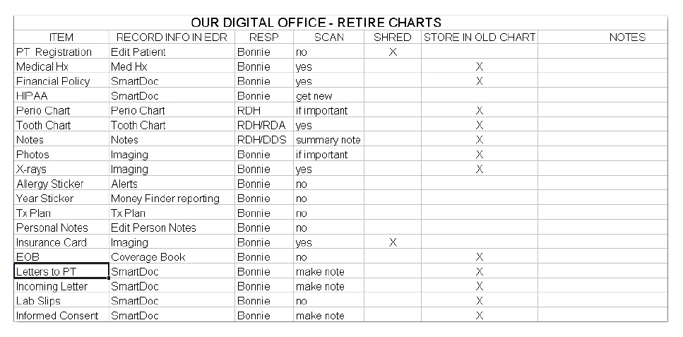 It usually takes years to create all of the paper charts belonging to a dental practice. It is important to remember that the charts do not need to be retired immediately. One sure way to frustrate staff and patients is to file away charts prematurely, before transferring all required information needed to treat the patient with a full understanding of the patient’s prior dental history. To make sure all the pertinent information is transferred to the EDR, start by recording a list of all information stored in the paper chart in another spreadsheet (Figure 6).
