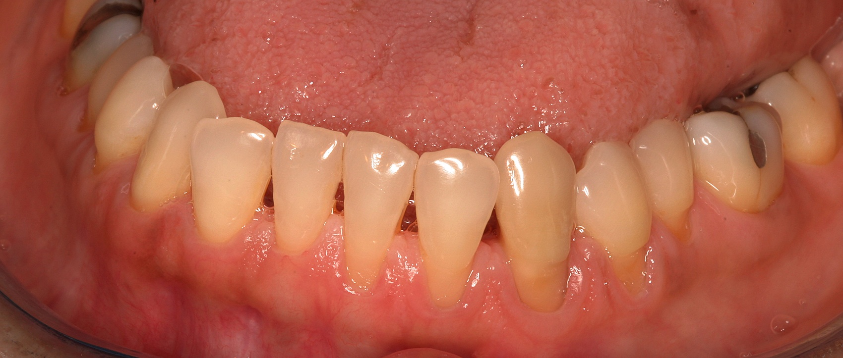 In the coming decades, restorative treatment for aging patients who experience facial growth with recession and erosion below the cemento-enamel junction because of tooth movement may be especially challenging. However, if dentists can employ the tenets of regeneration using autogenous tissues or a cellular dermal matrix combined with enamel matrix derivatives as a regulatory protein, they may predictably achieve large amounts of root coverage with thickened periodontium. This would not eliminate the need for restorative dentistry, but would enable restorative dentists to place restorations that are supragingival and are easily accessible for the patient and the therapist during maintenance (Figure 8 through Figure 10).