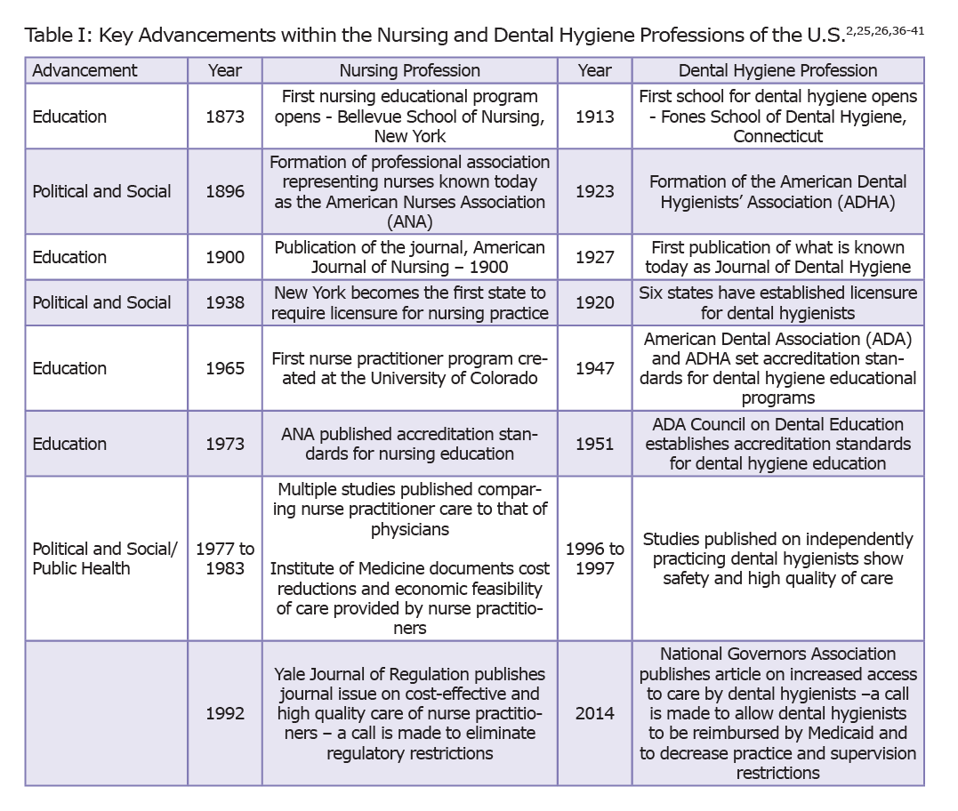 Table 1 provides additional parallels between the professional advancement of nurses and dental hygienists. These key advancements in both the nursing and dental hygiene professions allow healthcare providers to see similarities and the benefits of strategically moving the profession forward in education, political, social, and public health arenas.