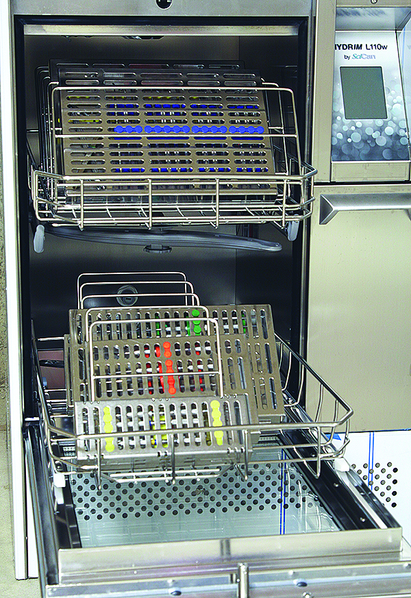 Virtually all commercially available cassettes are perforated cassettes; these are preferable to containers that are completely solid. Solid cassettes may not allow steam or chemical vapor to reach the contents for sterilization to occur. Additionally, cassette perforations allow thorough ultrasonic or instrument washer cleaning. Other features to consider would be instrument rails, strips, holders, or racks inside the cassette that are used to hold instruments in place. If these are made of soft material, they may decrease scratching on the instrument surfaces. Also, check to see if the holding devices provide adequate space between instruments to allow easy access during instrument cleaning prior to heat sterilization. A study performed at The Dental Advisor demonstrated that a single instrument washer or ultrasonic unit cleaning cycle was able to completely remove bioburden coated and dried onto instruments and cassette rails.3