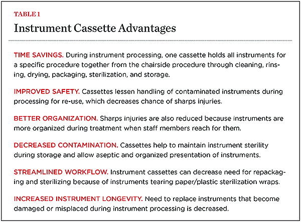 Instrument cassettes were first introduced in hospitals to organize instruments into procedure sets. They were later incorporated into dental school clinics, and in recent years have also become increasingly popular in dental offices. One important feature of instrument cassettes is that a single cassette can be used to hold and organize a complete set of instruments for a specific procedure (Figure 1). This convenience eliminates the need to gather multiple packages for a procedure. In addition, cassettes allow for less handling of contaminated instruments during cleanup and reprocessing. This latter attribute can provide additional safety by enhancing instrument flow while saving time. Table 1 summarizes the main advantages of using a cassette system in dental practice. Figure 2 shows an instrument cassette ready for chairside use.