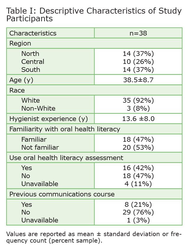 State and national studies of dental clinicians’ communication techniques are helpful in detecting broader trends, but are less relevant at regional or systems levels where, due to organizational differences that affect provider-patient interactions during clinical encounters, oral health improvement interventions are most likely to occur.15 No published studies to date have examined dental hygienists’ communication techniques within an integrated healthcare system. This is an important research gap to address in order to guide subsequent interventions designed to increase dental hygienists’ use of effective communication techniques, particularly for low literacy patients. The primary aim of this study was to assess the routine use of communication techniques recommended for use with low oral health literacy patients by dental hygienists in the Marshfield Clinic Health System and general Marshfield area, as well as to identify indicators of routine use of these communication techniques. The results will determine the need for an intervention for dental hygienists regarding communication techniques used with low literacy patients.