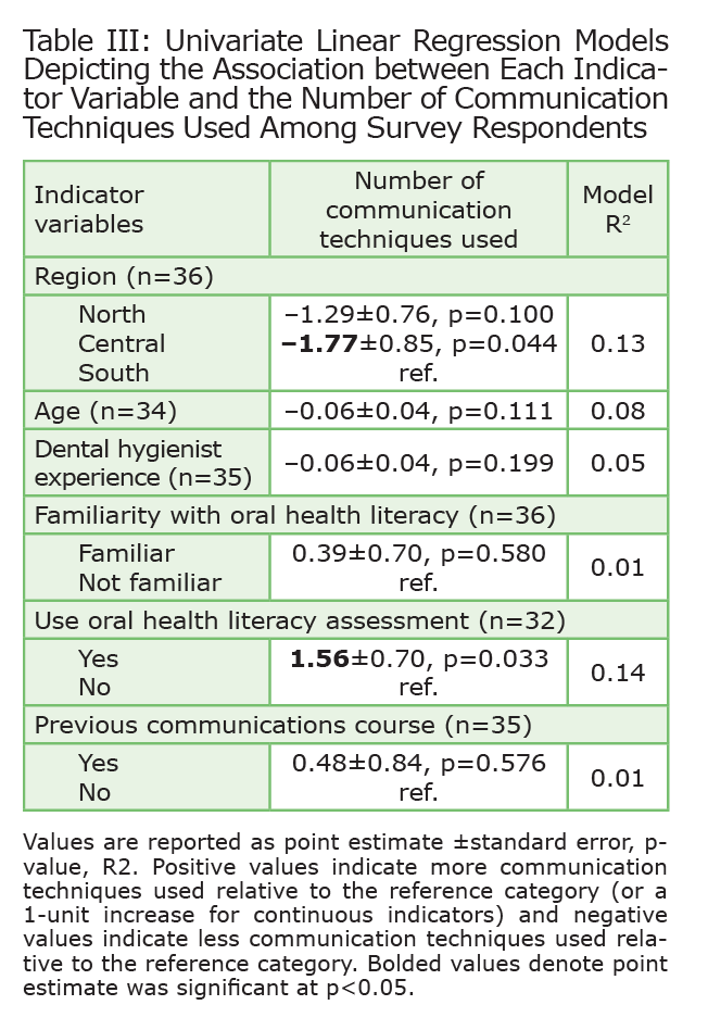 As reported in Table 3, findings from the regression analyses indicated that geographic practice region and the use of oral health literacy assessments were the only significant indicators of the number of communication techniques used routinely. Specifically, dental hygienists from the Southern region of the Marshfield Clinic service area had the greatest use of communication techniques, with those in the Central and Northern regions using 1.8 (P = .044) and 1.3 (P = .1), respectively, fewer techniques on average. In addition, dental hygienists who reported using oral health literacy assessments also used an average of 1.6 (P = .033) more communication techniques relative to dental hygienists who did not report using oral health literacy assessments. Other indicators had relatively weak associations with communication techniques.