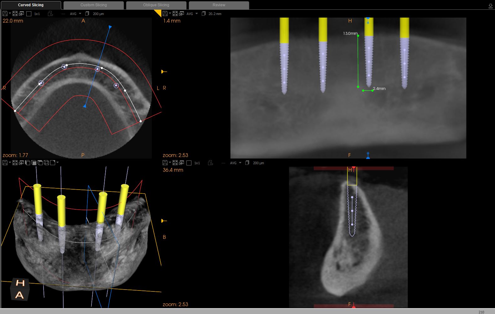 In a statement of position, the American Academy of Oral and Maxillofacial Radiology recommends that a form of cross-sectional imaging be used to guide surgical implant placement.20 In this case a small-volume cone-beam computed tomography (CBCT) scan was taken of the anterior mandible to further develop the surgical plan. From these images the position of the mental foramen and any anterior loop of the mental nerve was established (Figure 1). Given the length and width of bone, four 2.4-mm-wide by 13-mm-long implants were chosen for this case. The position of the two distal implants would allow for a margin of safety in regards to the mental nerve but would be placed as far posterior to the two most anterior implants as allowable. Maximizing the anterior-posterior, or A-P, spread of the implants would minimize any cantilevering forces acting on the denture.