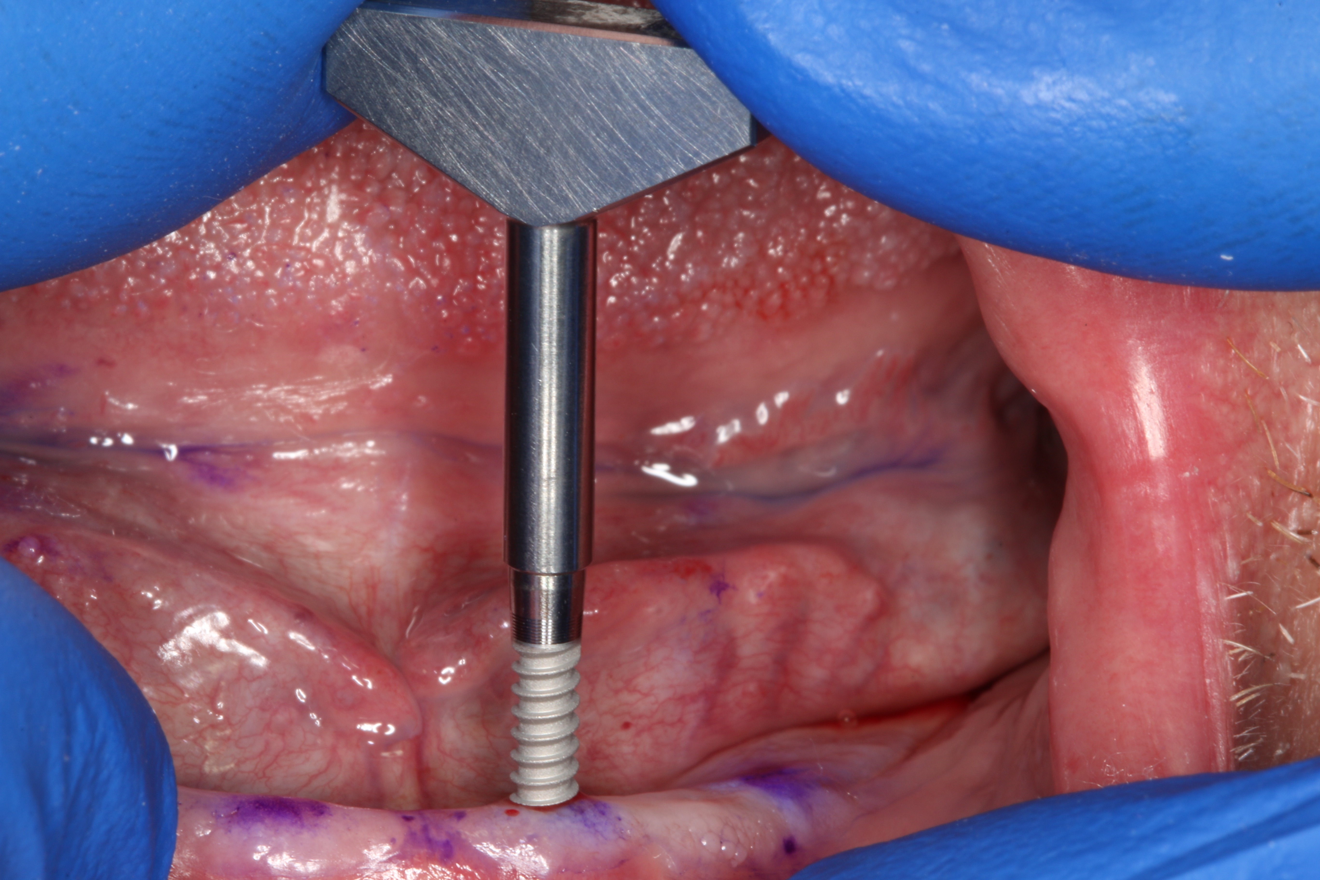 A sterile operating environment was established. Prior to administering anesthesia the location of the mental foramen and the exiting neurovascular bundle was established by palpating the facial aspect of the mandible; this procedure was performed in conjunction with the cross-sectional CBCT imaging. If this technique is inadequate, a radiographic splint can be used to further verify the position of the mental foramen; often, a patient’s existing mandibular denture can be modified for this purpose. A surgical marker was used to mark the proposed implant positions with at least 3-mm inter-implant spacing (Figure 2). Establishing the position of the mental nerve prior to administering local anesthesia is necessary, because the injection site will become filled with anesthetic solution, and/or submucosal hematoma will interfere with accurate palpation. Sufficient pain control was achieved via infiltration of local anesthetic in the area of the mental foramen as well as along the crest of the anterior mandible. Care was taken to minimize the patient’s exposure to epinephrine.