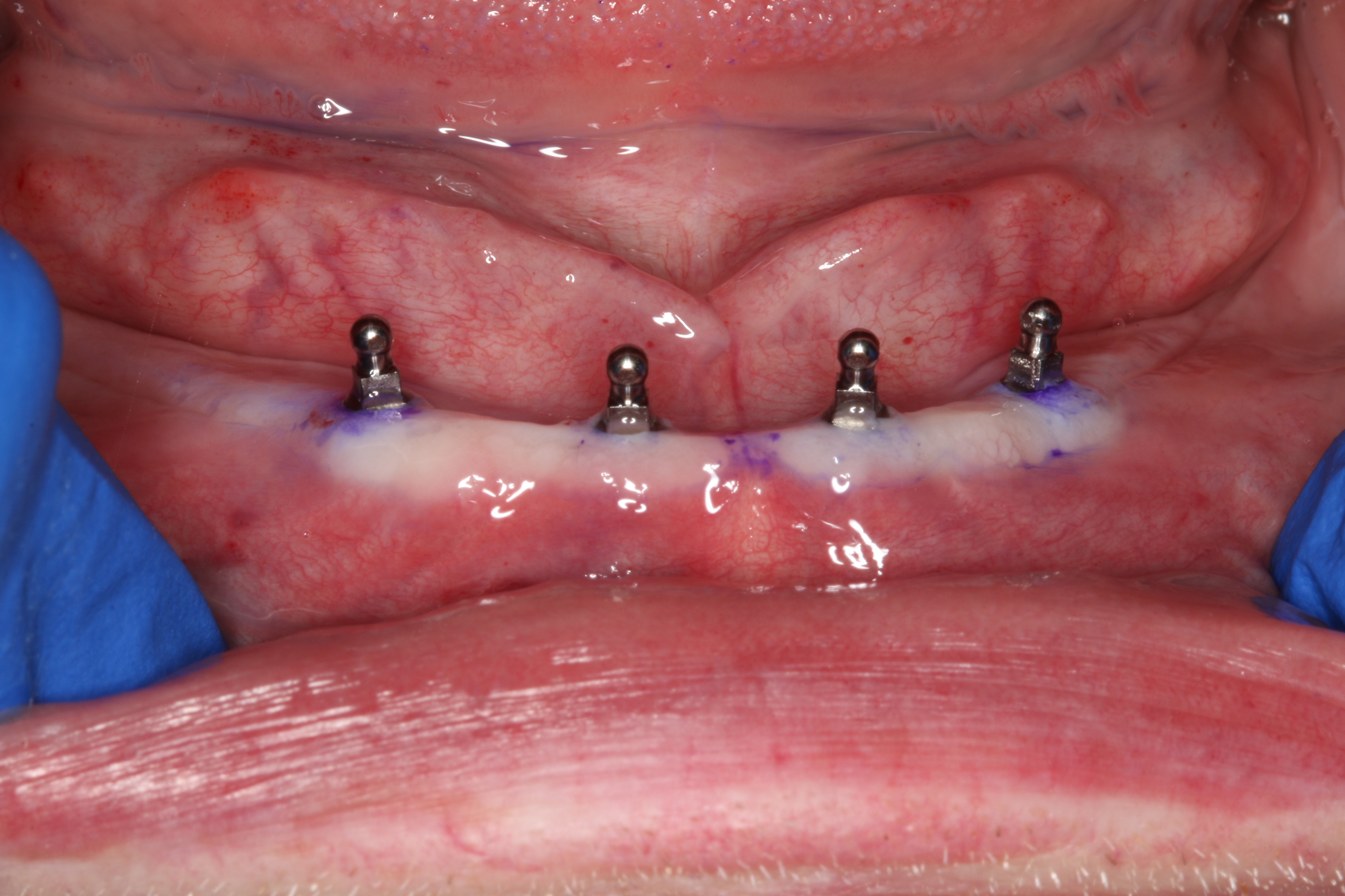 Fabrication of a mIRMOD and opposing maxillary denture does not differ greatly from traditional dentures. Final impressions were taken immediately following implant placement. An appropriate “stock” thermoplastic impression tray was chosen and a two-stage impression technique applied. In this technique, a vinyl polysiloxane (VPS) putty was first used to fill the impression tray, which was inserted into the mouth, and border molding was completed. The putty-lined impression tray was removed before setting and inspected to ensure that all borders and muscle attachments were captured. While soft, the putty impression was washed with light-body VPS and carefully reinserted, and border molding was repeated. The final impression was removed and inspected when it had completely set (Figure 10). The use of impression copings was contraindicated; the laboratory would place implant analogues directly into the cavities created by the implants before pouring the master casts(Figure 11). For patient comfort, removable implant attachments retained by resilient o-rings were placed over the mini-implant o-ball retentive feature between appointments.