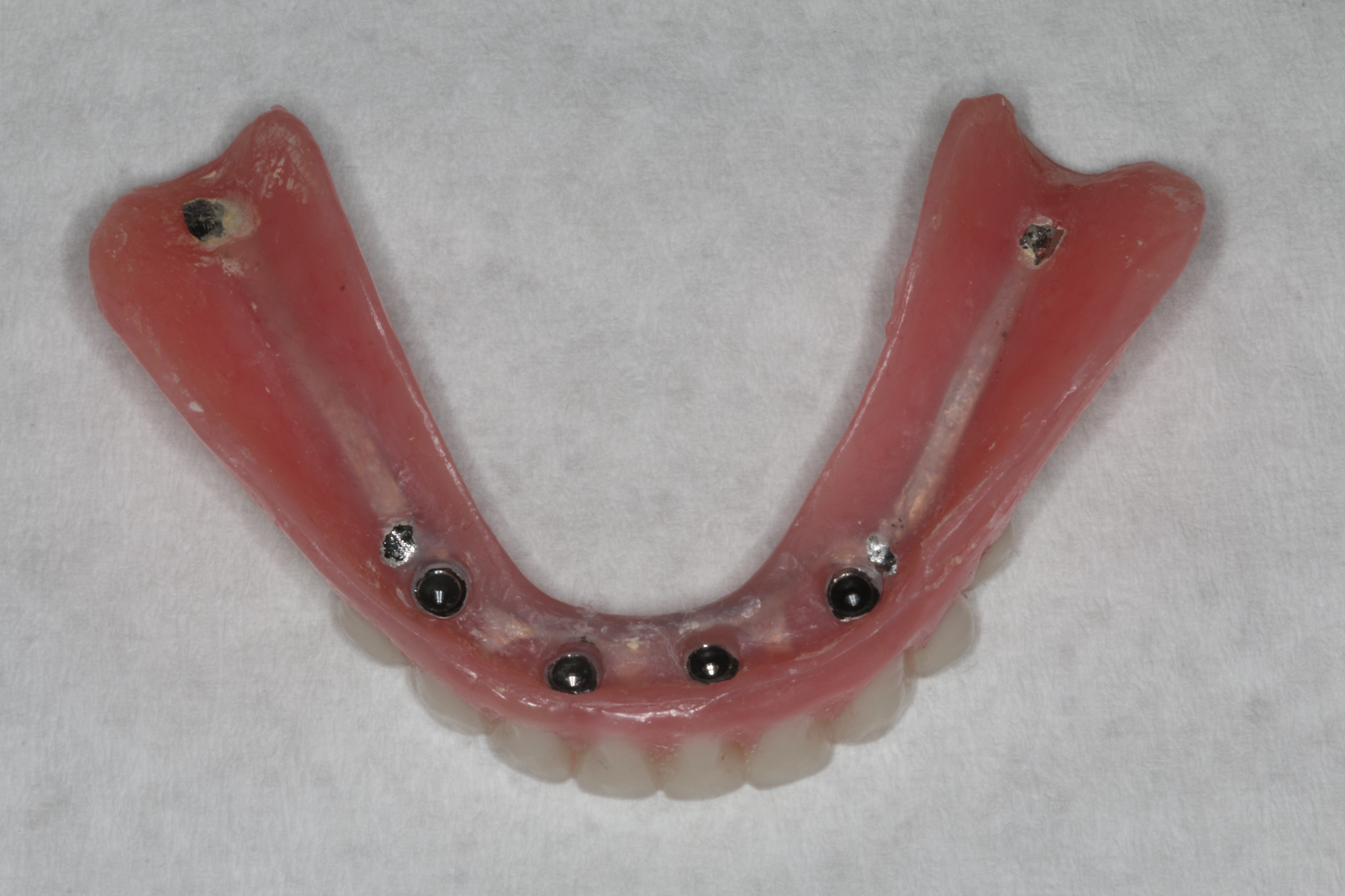 At 6 weeks post-surgery the implants showed proper healing (Figure 14) and the denture was delivered (Figure 15). Overpressurized areas that create sore spots were identified and adjusted as needed.