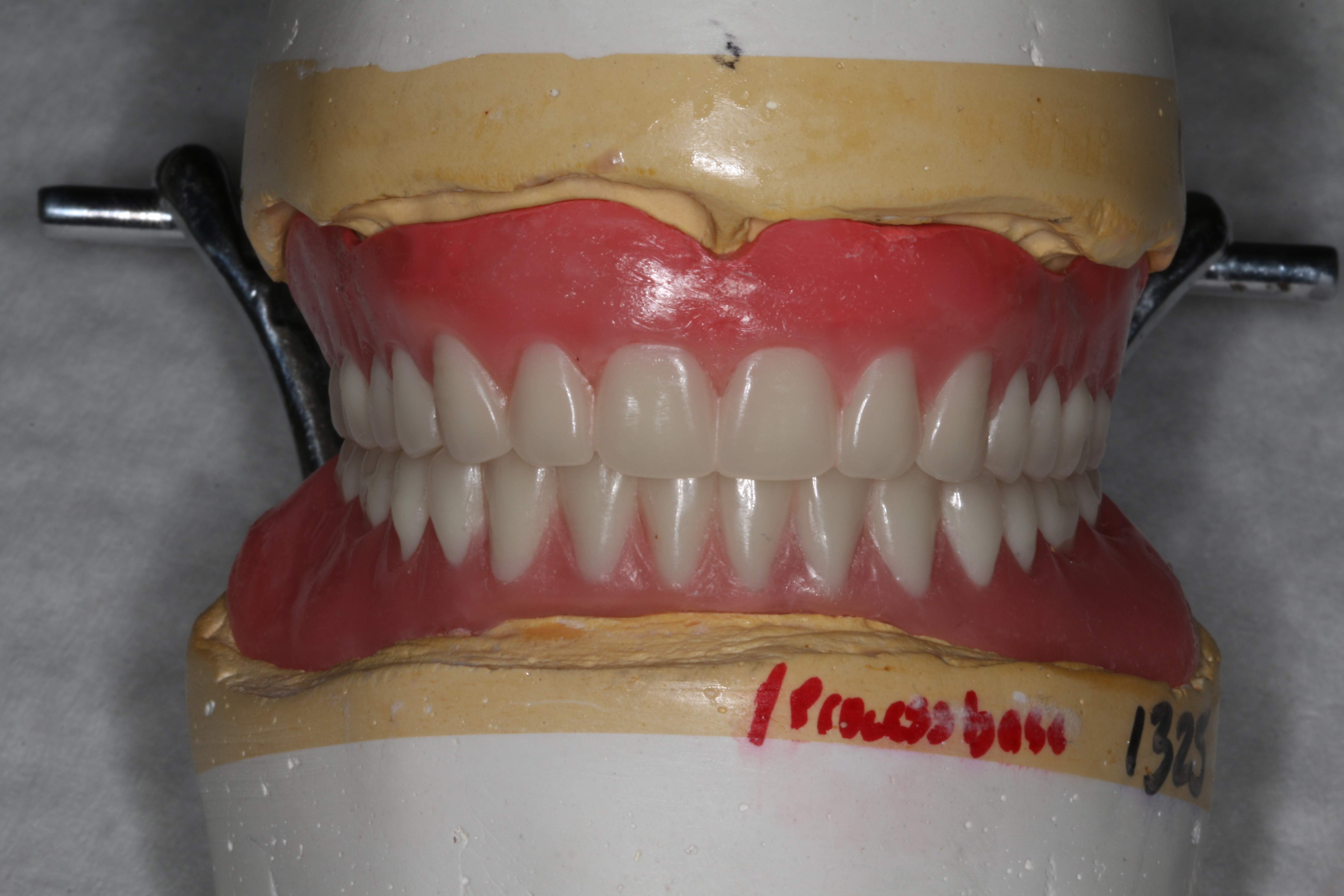 Specific instructions were given to the laboratory to fabricate a cobalt-chromium framework that would add strength and rigidity to the largely acrylic mIRMOD. When fabricating the mIRMOD the laboratory was asked to invest and process the denture base, framework, and female attachment components as a first step. This processed denture base would be used in conjunction with a maxillary denture base, usually made of gutta percha, and wax bite rims to capture jaw relation records. This approach was useful because it allowed for retention of the mIRMOD as records were taken and the subsequent try-in appointments were completed (Figure 12 and Figure 13).