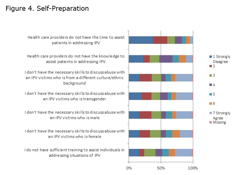Self-Preparation. Fifty percent or more of respondents somewhat disagreed, disagreed, or strongly disagreed that healthcare providers didn’t have the skills and knowledge to address IPV with all items except the last one (Figure 4). More than 45% somewhat agreed, agreed, or strongly agreed with the statement: I do not have sufficient training to assist individuals in addressing situations of IPV.