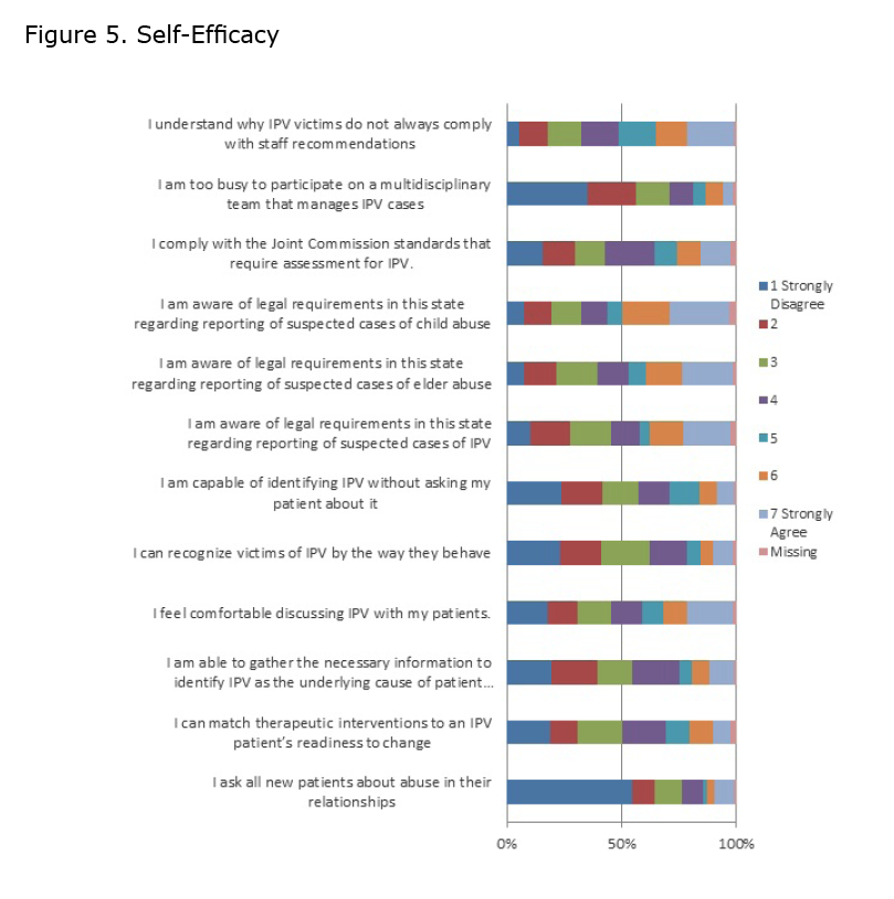 Self-Efficacy. Respondents were evenly divided in their response to the items related to self-efficacy (Figure 5). The items that respondents more strongly disagreed, disagreed, or somewhat disagreed with included the following: I am too busy to participate on a multidisciplinary team that manages IPV cases (70.9%); I ask all new patients about abuse in their relationships (76%); I am capable of identifying IPV without asking my patient about it (57.3%); and I can recognize victims of IPV by the way they behave (62.4%).